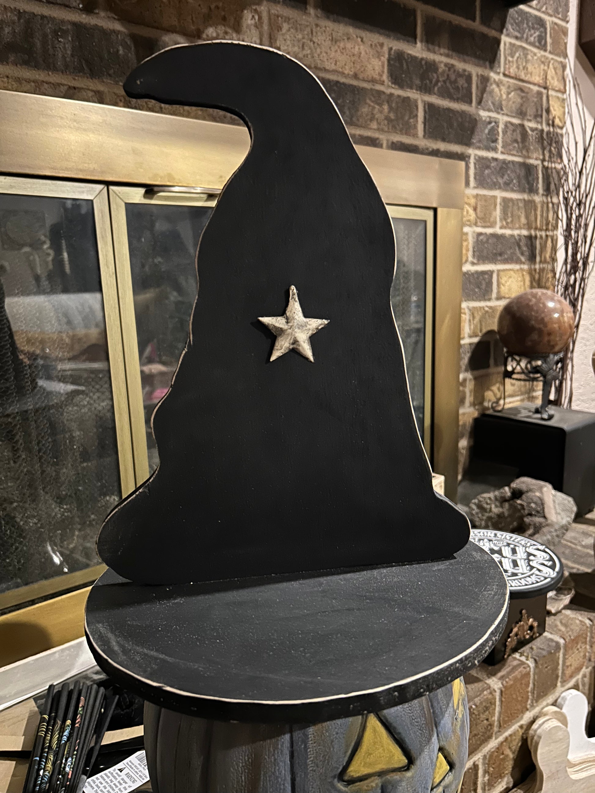 Handmade rustic wooden witch hat décor, crafted by me. 🌻🕷️
