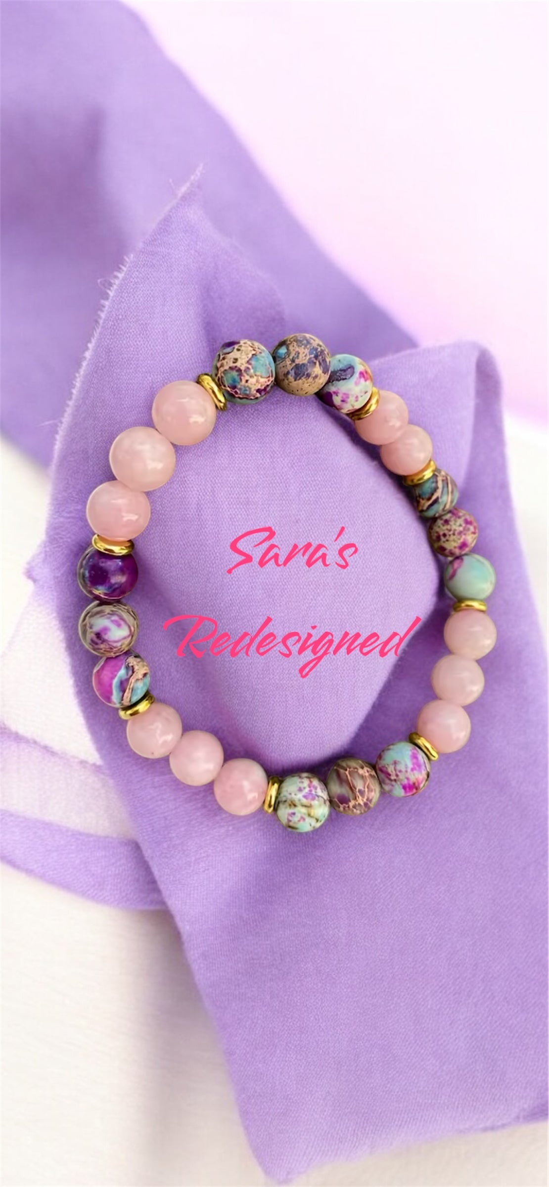 Attract love and positive energy with this stunning women's bracelet. Crafted with colorful imperial jasper and rose quartz beads, it's both stylish and beneficial. These stones are known for their ability to promote love, compassion, and harmony. Elevate your look and your mood with this beautiful piece. Stretch bracelet.
