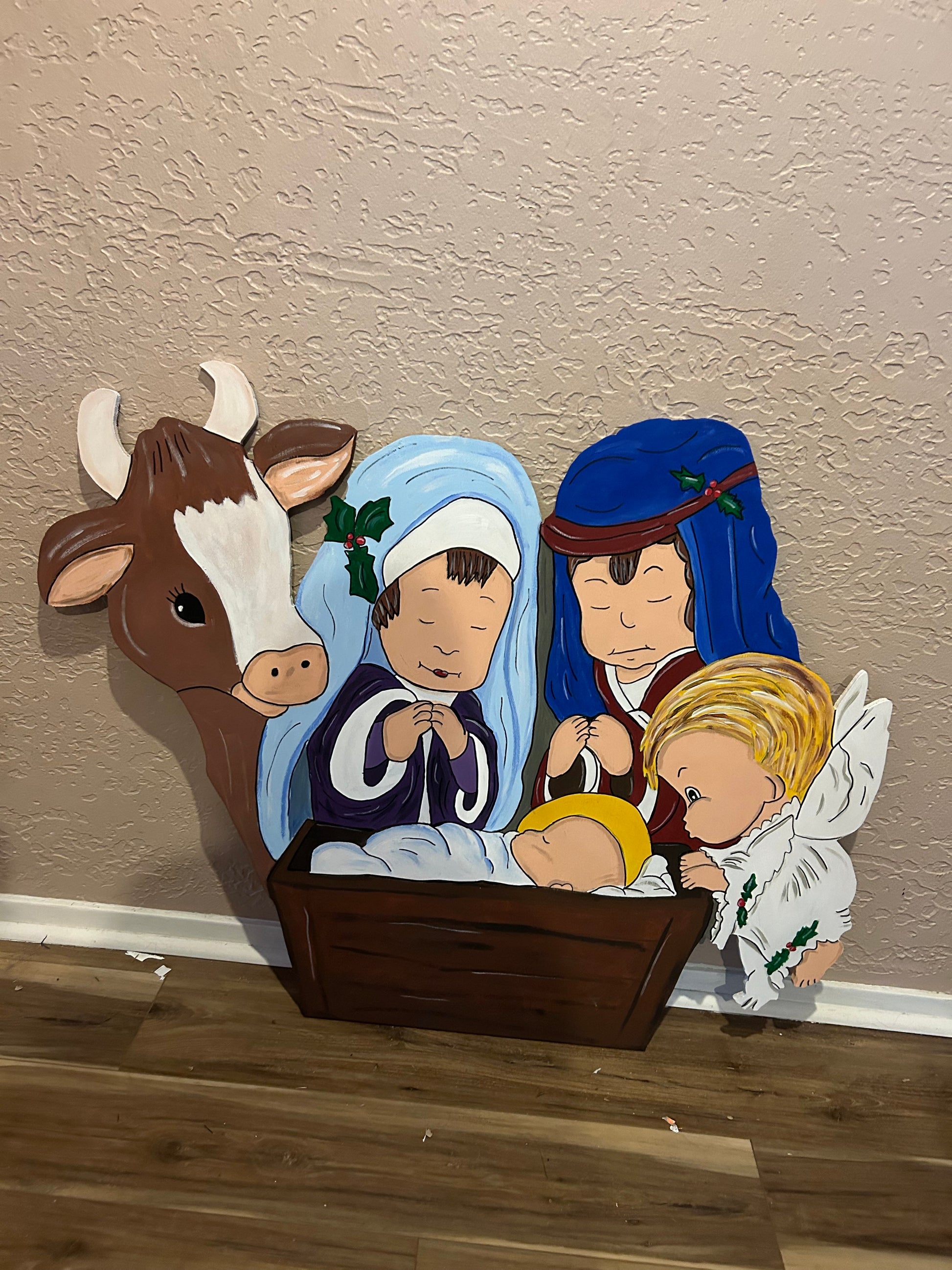 This charming Christmas Nativity set includes a barn scene complete with an angel, Joseph and Mary, and a cow. Made with attention to detail, this set will add a touch of wonder to your holiday decor. Bring the story of the birth of Jesus to life with this beautiful display.