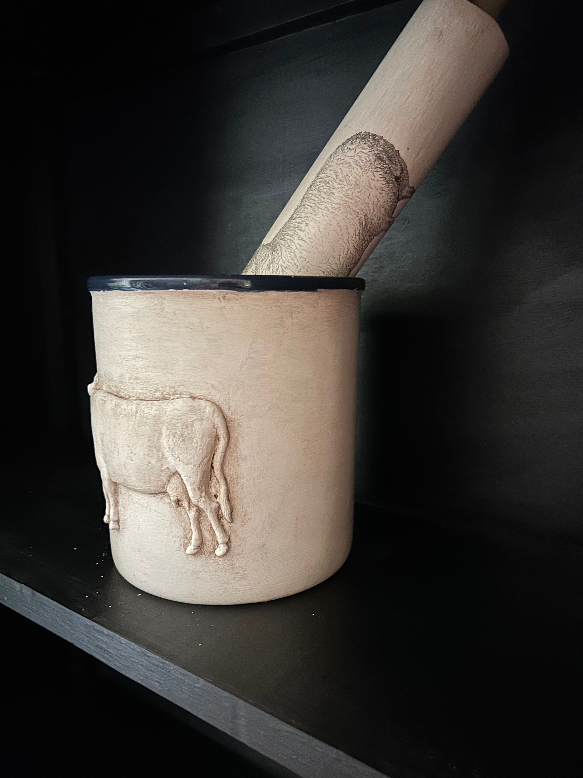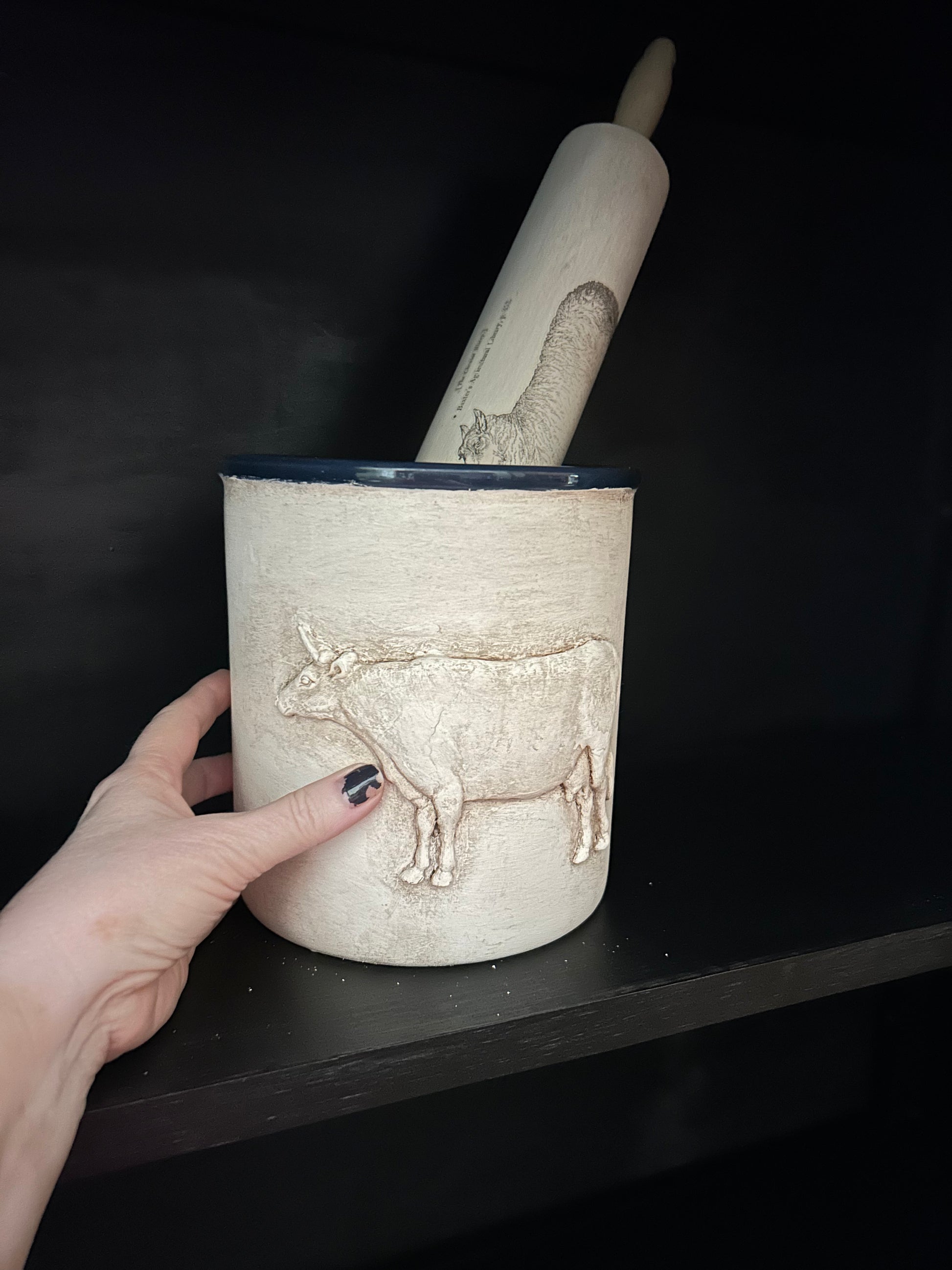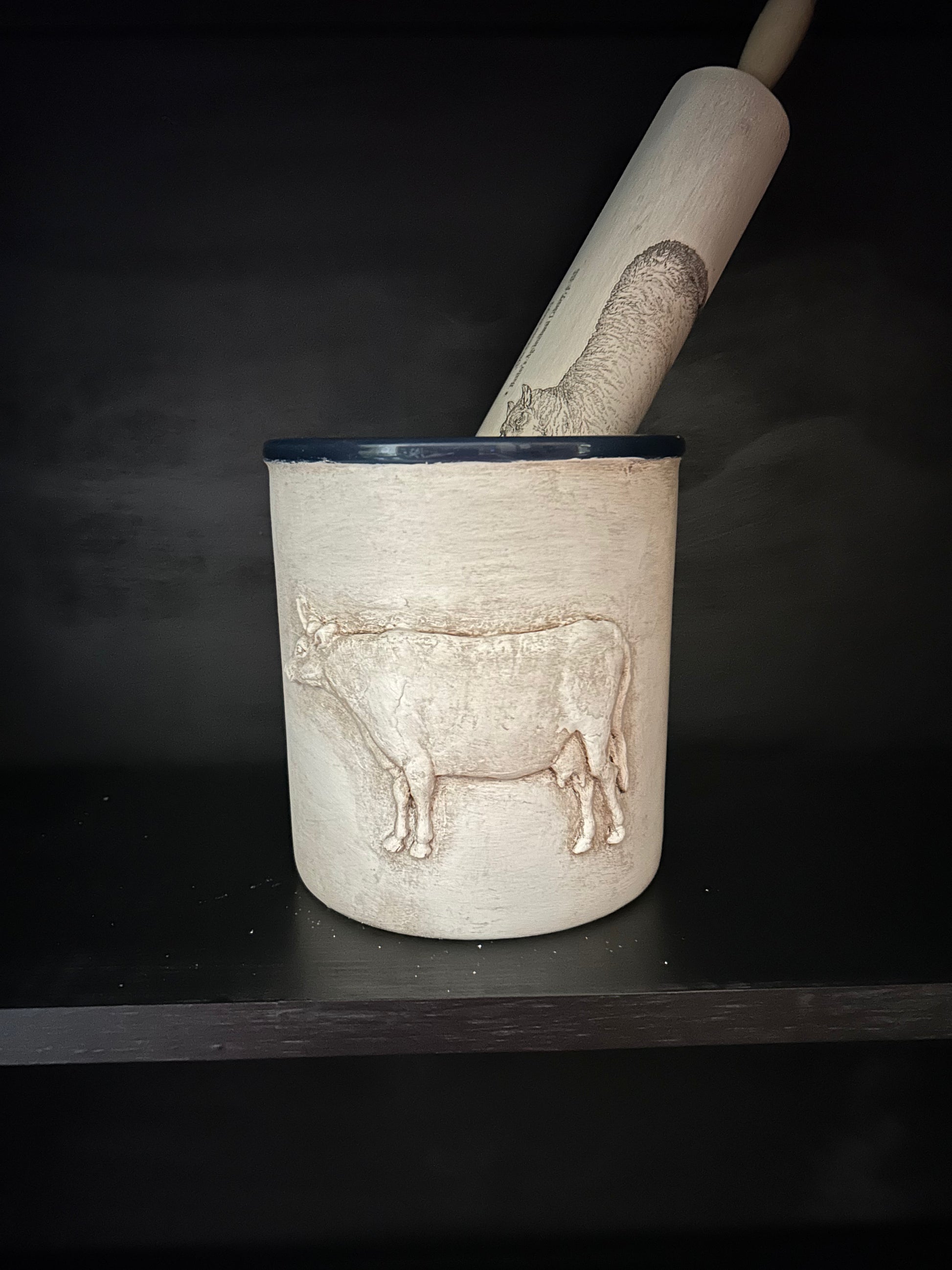 This hand-painted utensil crock, designed by Sara, features a charming farmhouse cow motif. Keep your kitchen organized in style with this functional and decorative piece that adds character to your space. Perfect for storing all your cooking essentials.