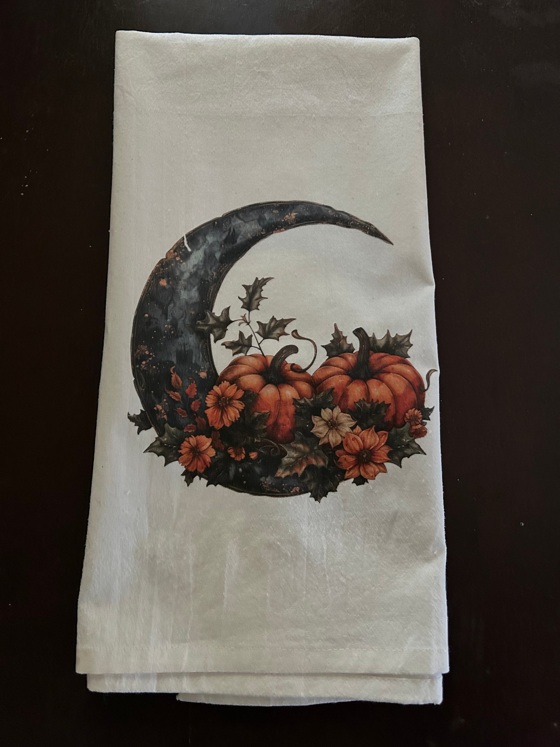 Introduce some whimsy to your fall kitchen decor with our Crescent Moon Fall Kitchen Towel. The full color, crescent moon and pumpkin design adds a festive touch to any Halloween or Thanksgiving celebration. Made from 100% ring-spun cotton with a thread count of 130, it's both durable and stylish. A unique gift for your witchy friends and family. Size is 28 in long and 18 in wide . Made by Sara’s redesigned