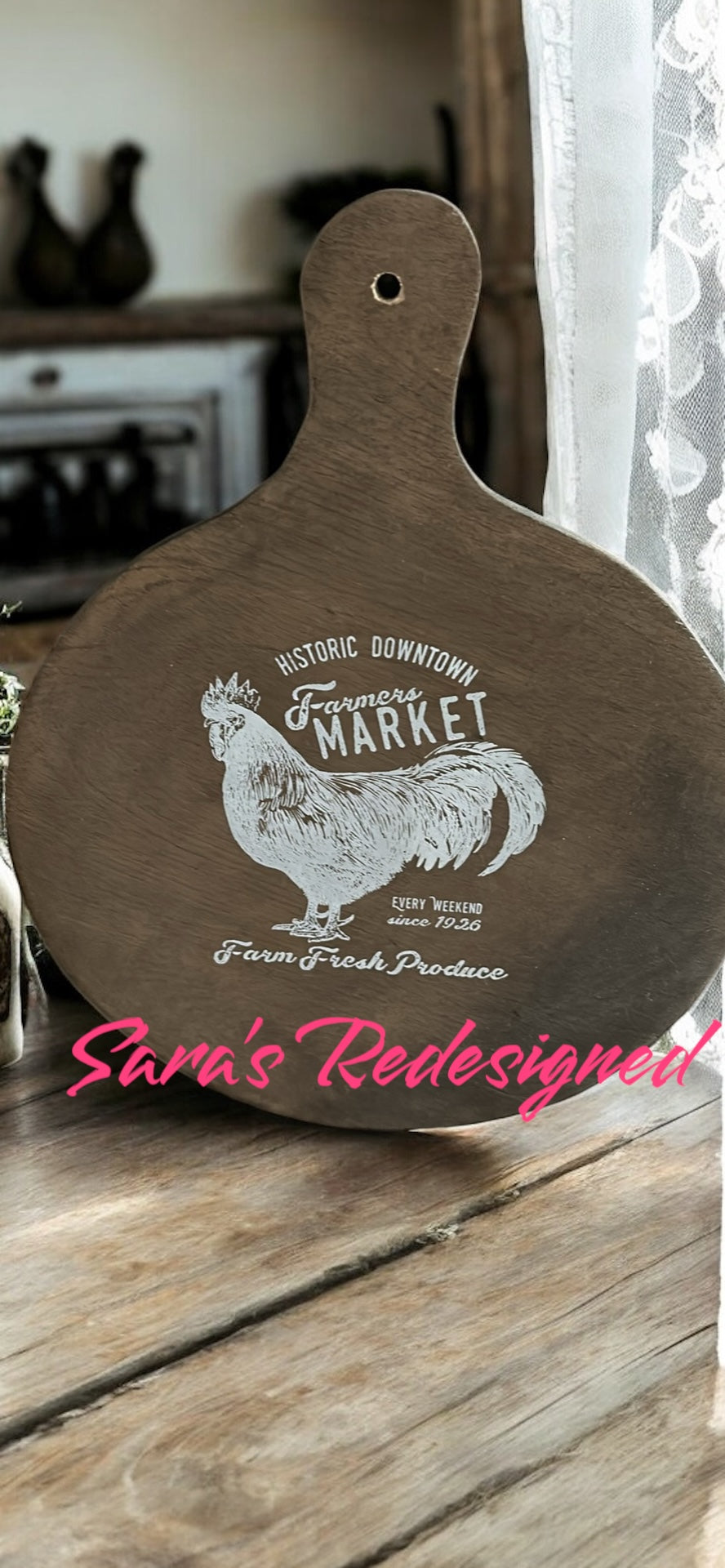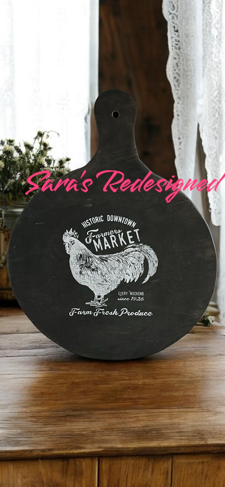This farmhouse-inspired rooster board adds the perfect touch to any kitchen or dining area. Made from hand-cut, half inch wood and hand-painted with care, it's not only a beautiful decor piece but also an eco-friendly choice as it's crafted from recycled materials. Elevate your space with this unique and charming farmers market rooster board. Size is 23 tall 17 wide. Ask me about custom order.