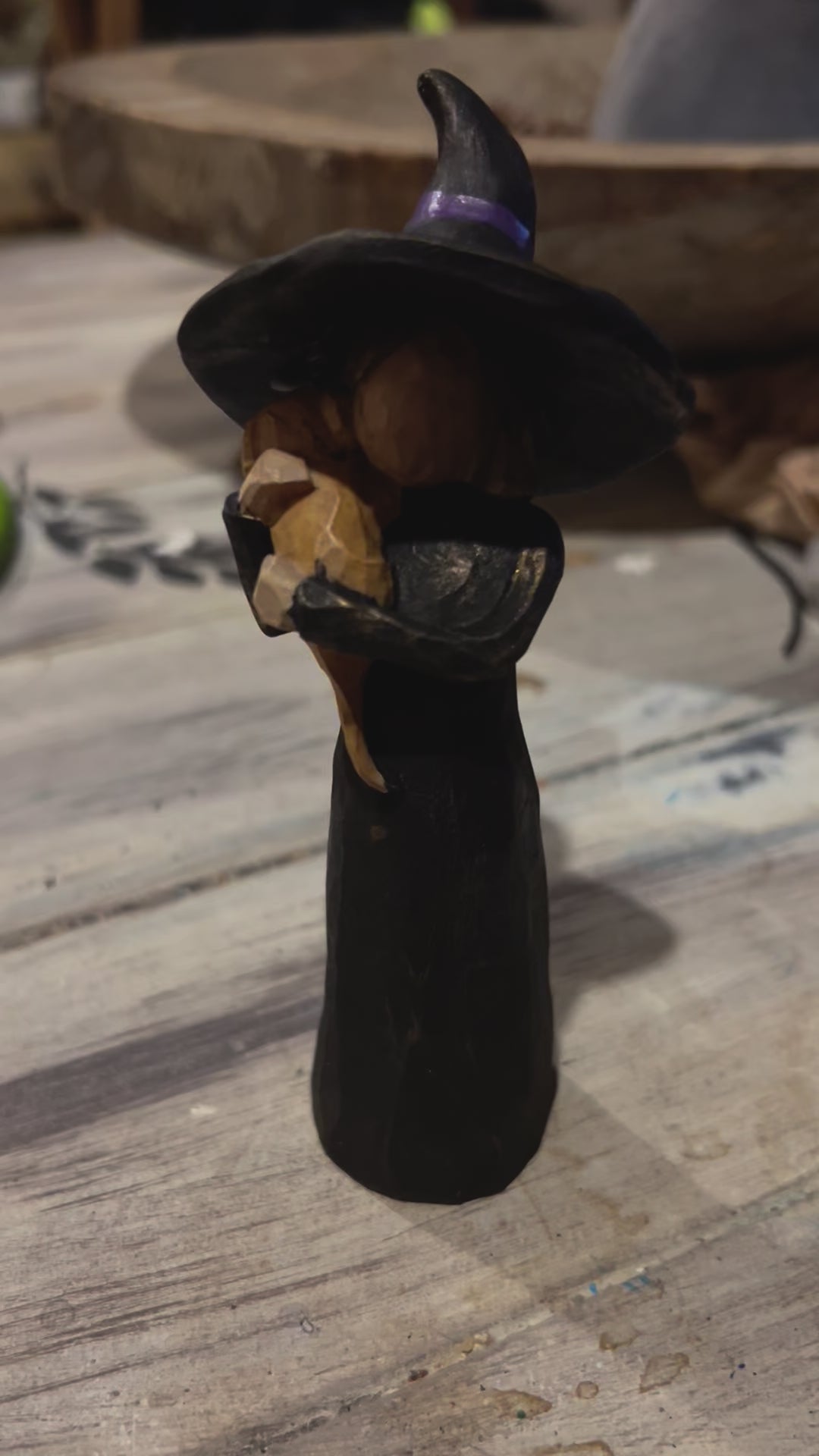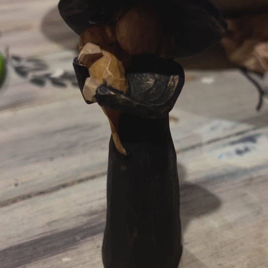 Expertly handpainted by Sara, this Halloween little witch figurine stands at 5 inches tall and 2 inches wide. Made from upcycled materials, it features an adorable witch holding her puppy. A unique addition to any Halloween decor.