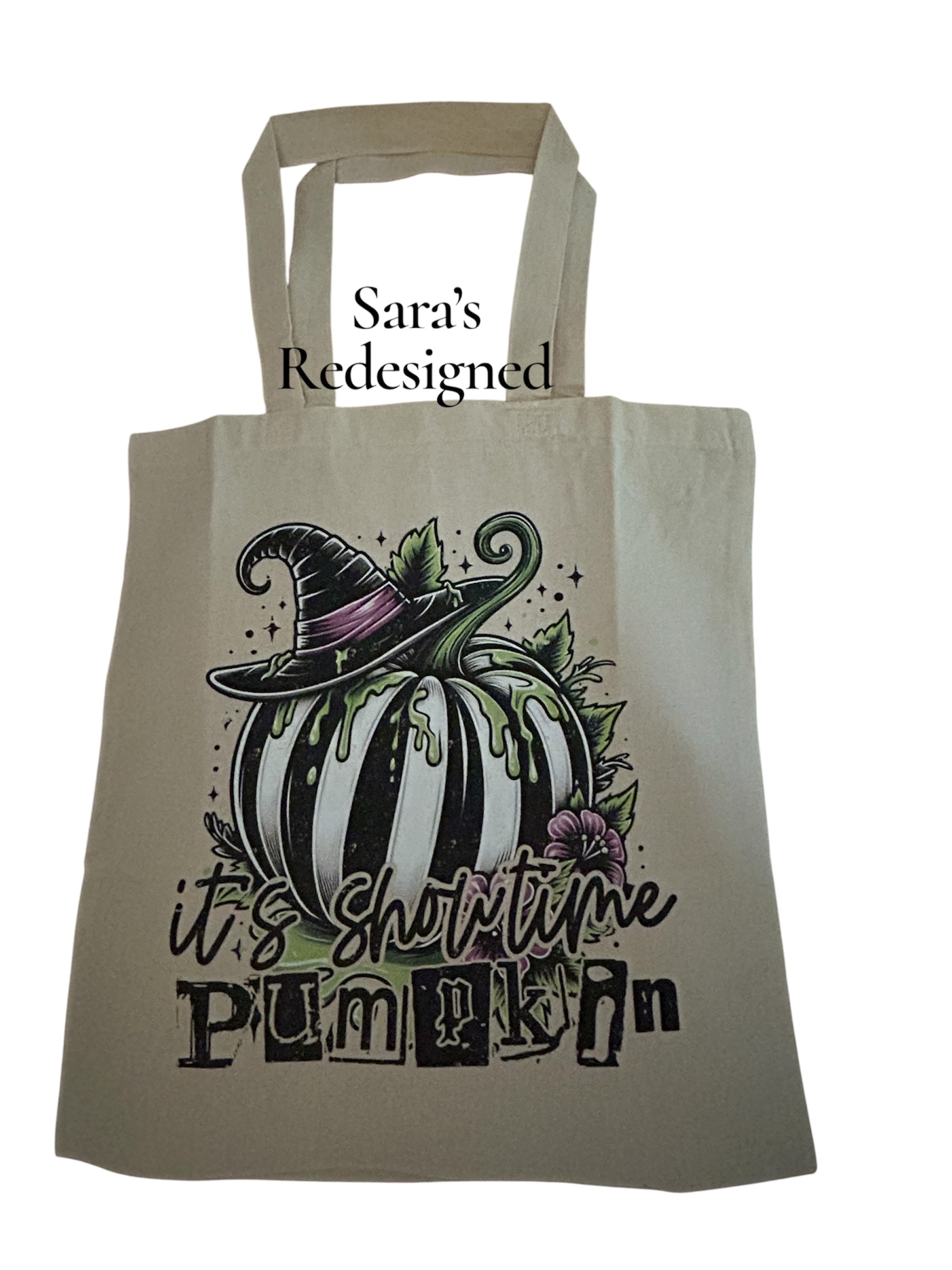 Expertly crafted by Sara's Redesigned, this Halloween tote bag is a practical and affordable choice. Made from durable canvas cotton, it's perfect for carrying books, collecting candy, or running errands. With a size of 15x17, it's the ideal accessory for the spooky season.