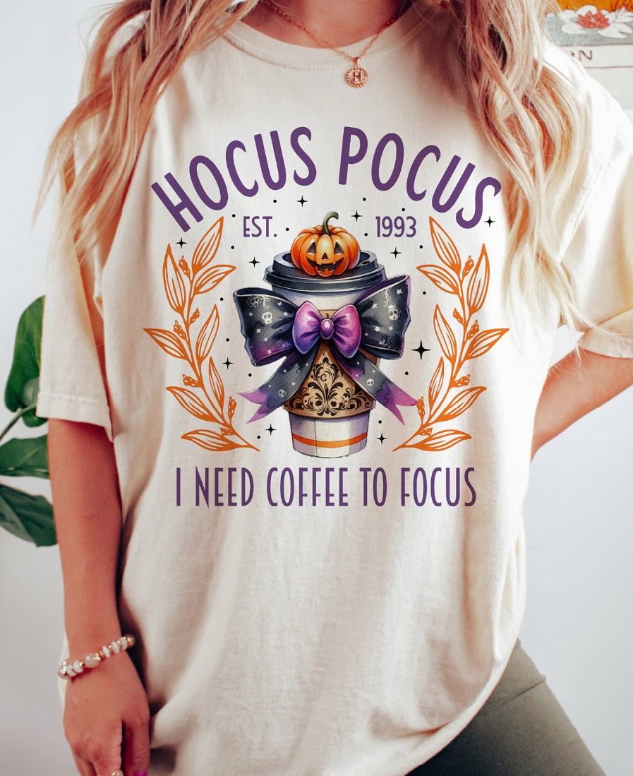Boost your Halloween spirit with the Hocus-pocus I need coffee to focus T-Shirt! Made by Sara, this shirt is perfect for any coffee lover and will keep you focused on all your spooky festivities. Don't miss out on this unique and fun addition to your wardrobe.