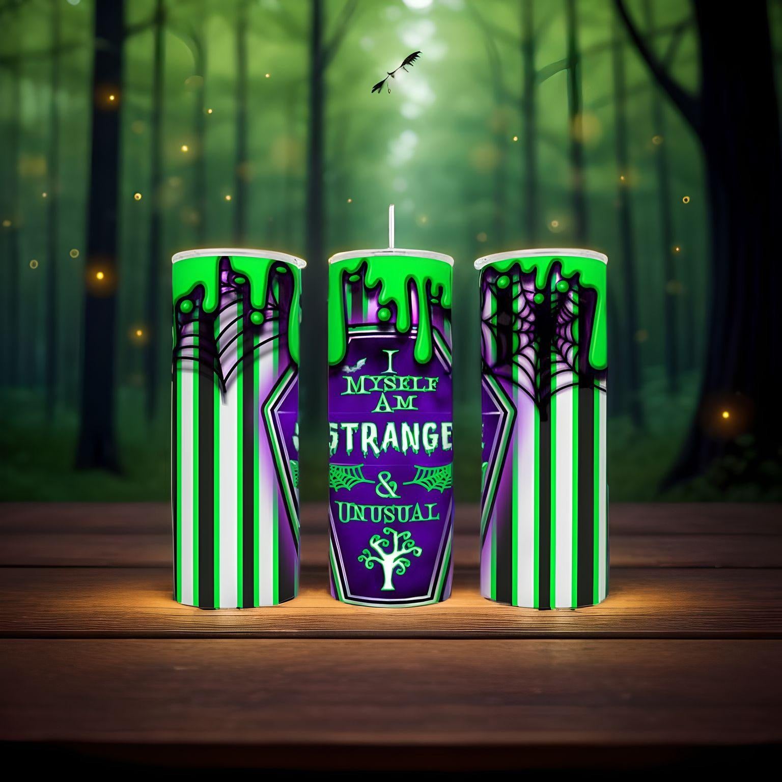 20 ounce skinny tumbler Introducing the I Myself Am Strange & Unusual tumbler, perfect for any Halloween or horror lover. This 20 oz skinny tumbler features a unique printed design, making it both stylish and functional for your on-the-go needs. Keep your drinks at the perfect temperature while showcasing your love for all things strange and unusual.
