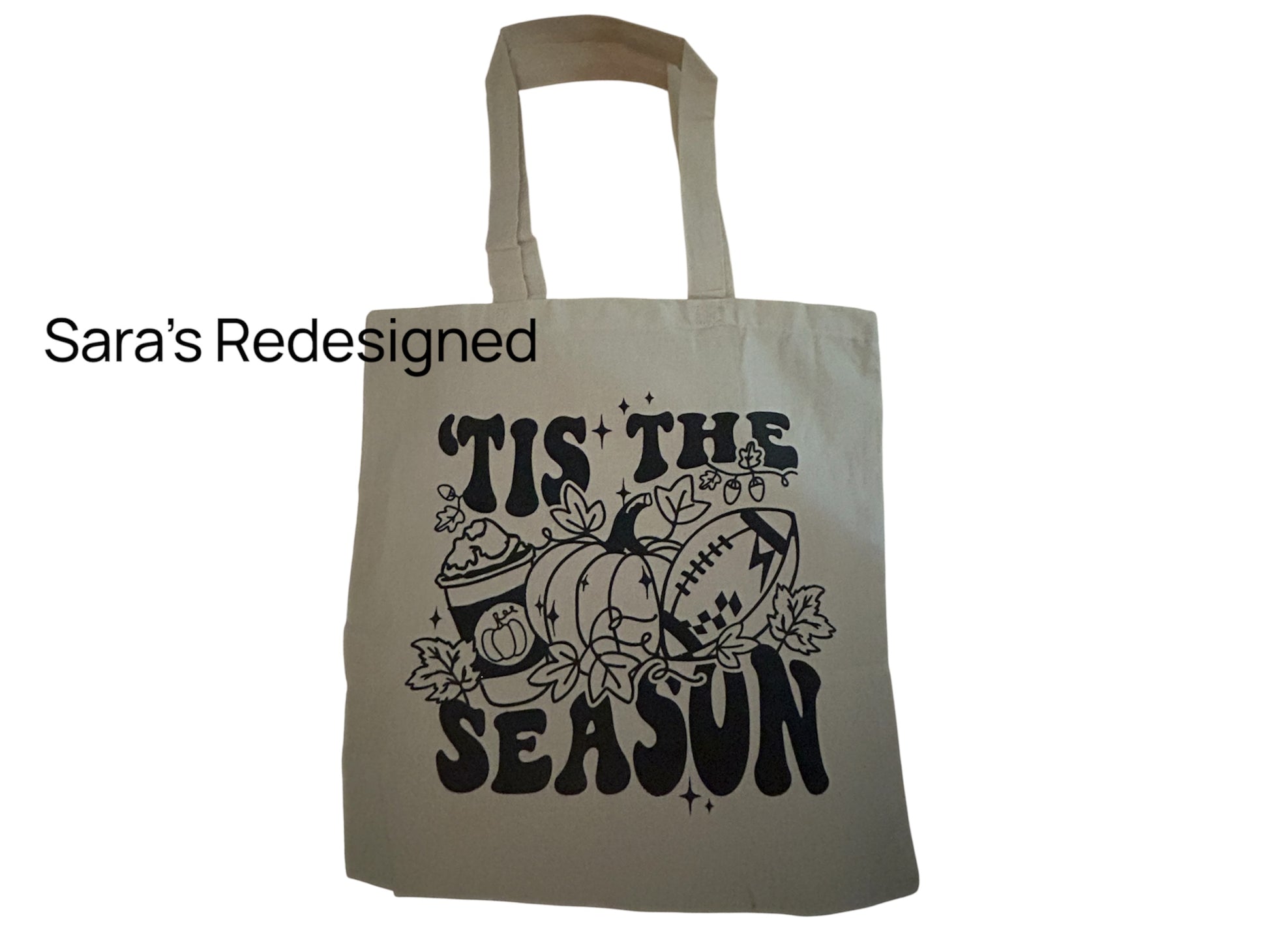 "The It's the season tote bag is a stylish and economical choice for any season. Made of durable canvas cotton, measuring 15x16, it provides ample space for all your essentials. Grab yours and elevate your fashion game!" Made by Sara’s redesigned