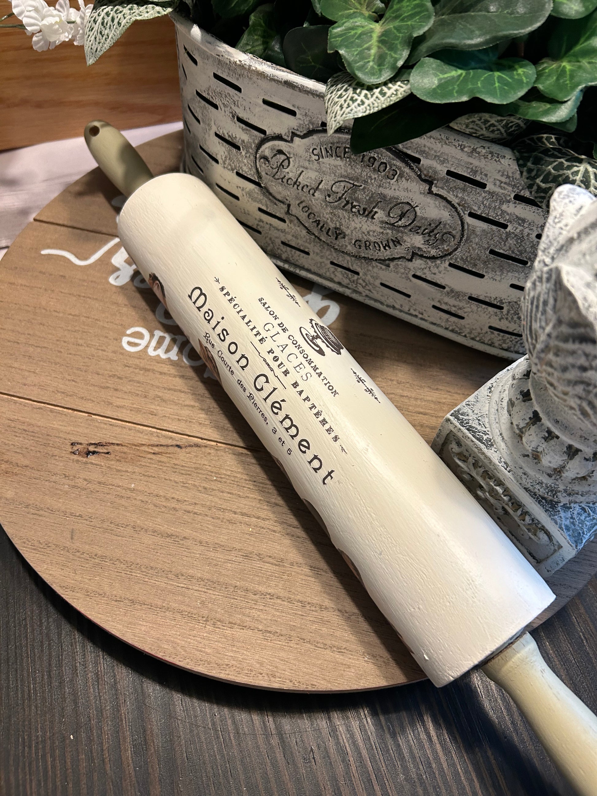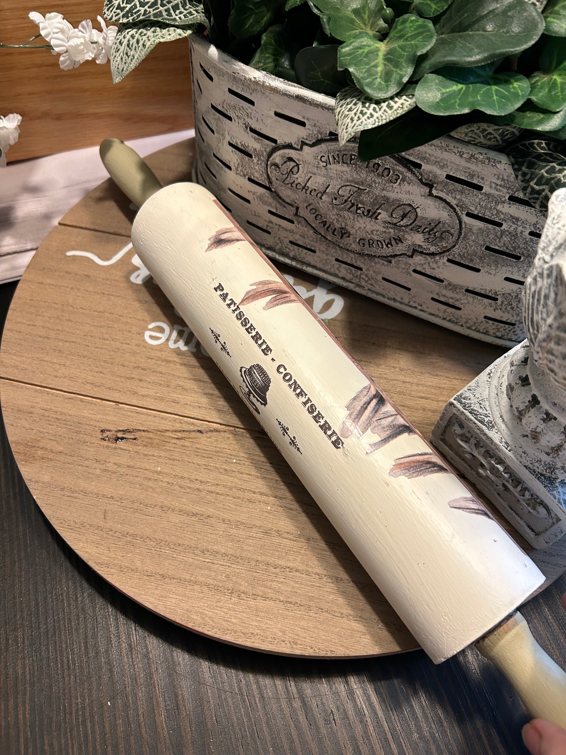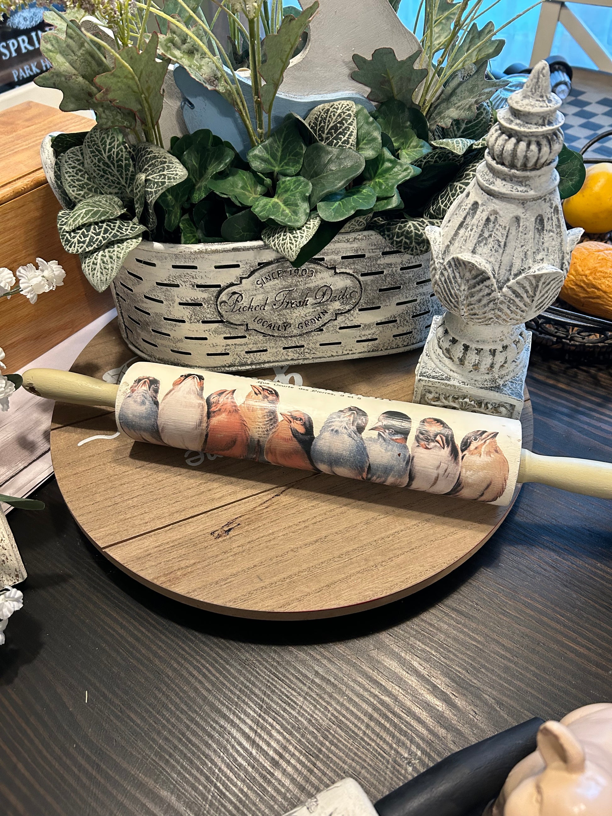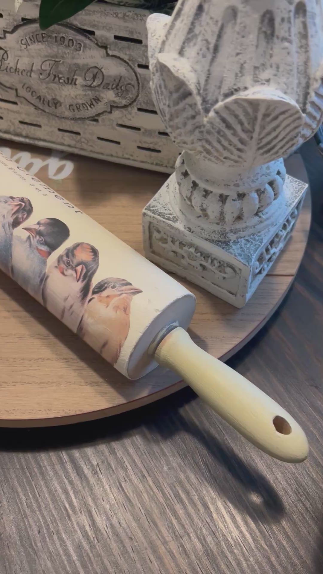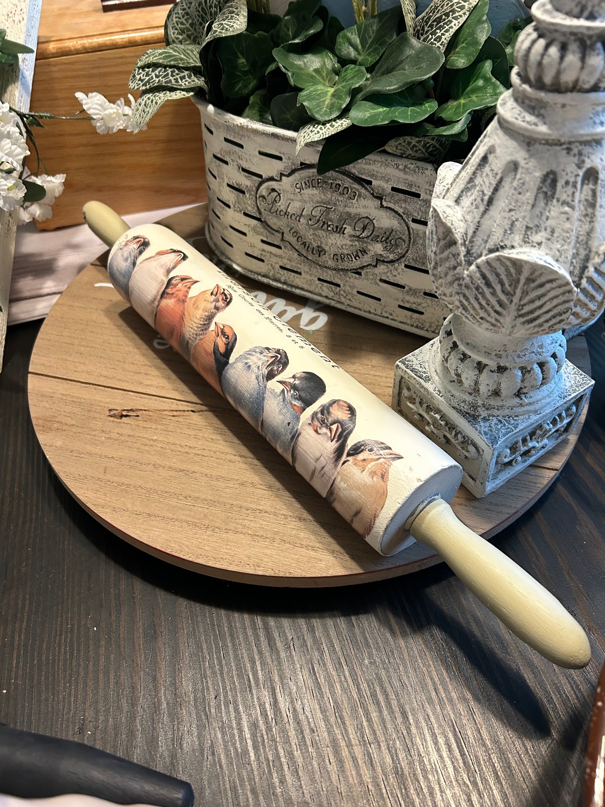 This vintage rolling pin by Sara's Redesigned features beautifully painted birds perched on a branch, making it a unique and eye-catching addition to your kitchen decor. As a thrifted item, it has been hand-picked for its quality and charm, and may show slight signs of wear or fading. Add a touch of nostalgia to your baking with this charming kitchen tool. 18 in