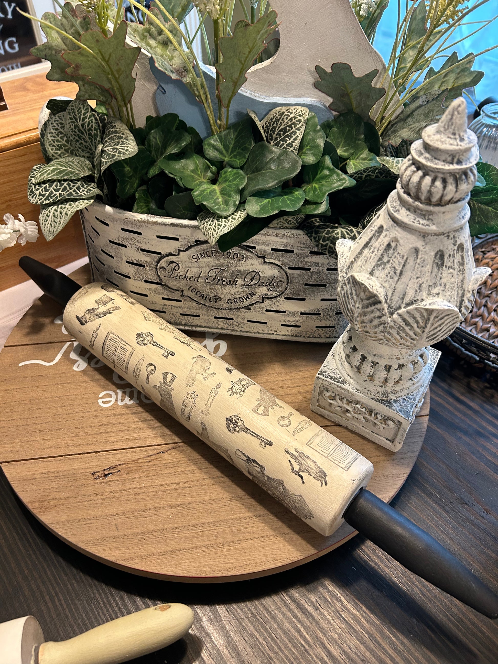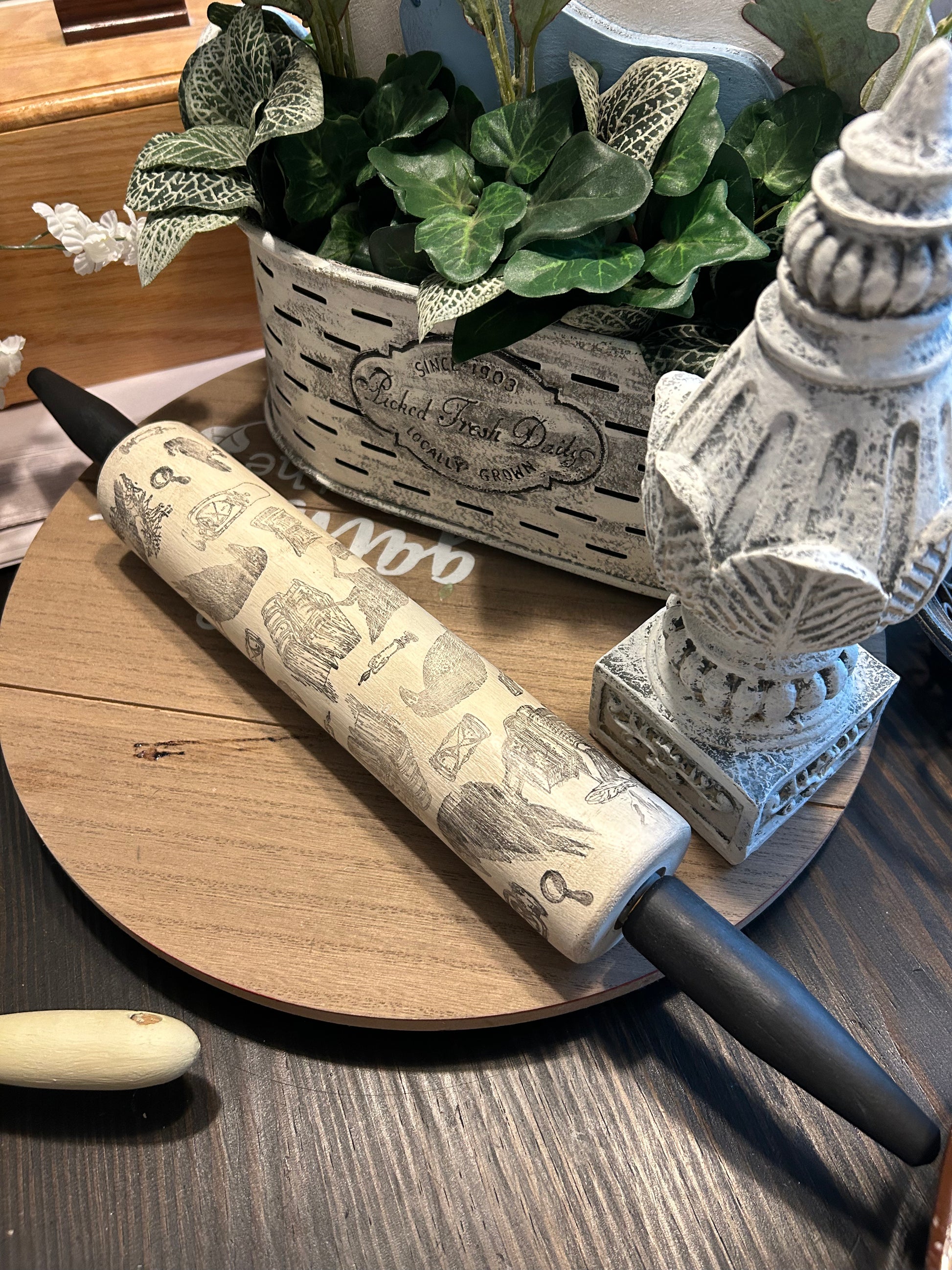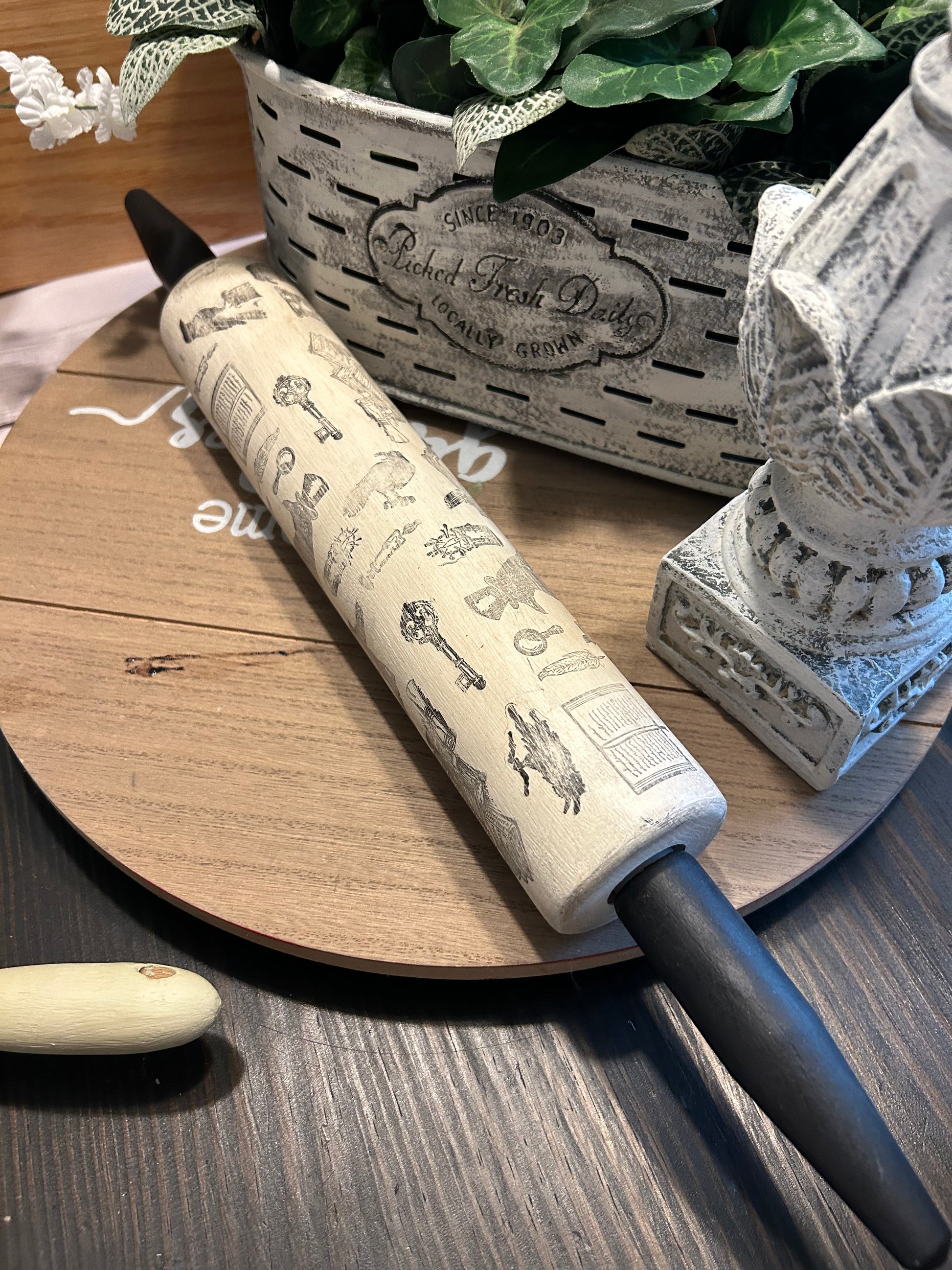 Add a touch of gothic elegance to your baking with our unique rolling pin. Designed by Sara, this rolling pin features upcycled vintage blackbird and crow motifs. Only available here, this rolling pin will surely make a statement in your kitchen. Touch of Halloween .