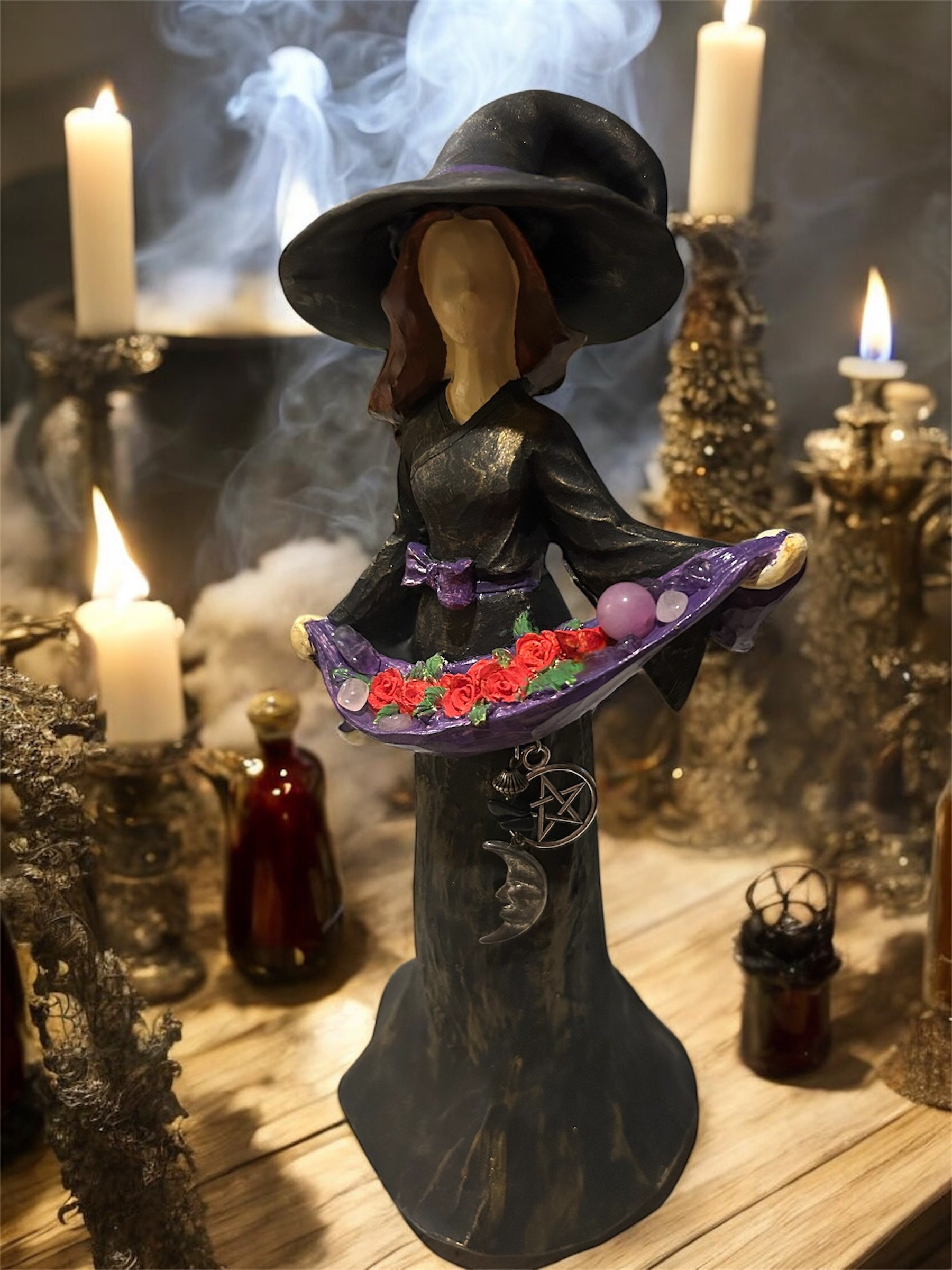 Hand-painted by Sara's Redesign, the Summer Solstice Witch is a one-of-a-kind addition to any Halloween or Gothic collection. Its up-cycled design and intricate details evoke the magic of the summer solstice, making it a must-have for any witch enthusiast. 9 in tall 3 in wide