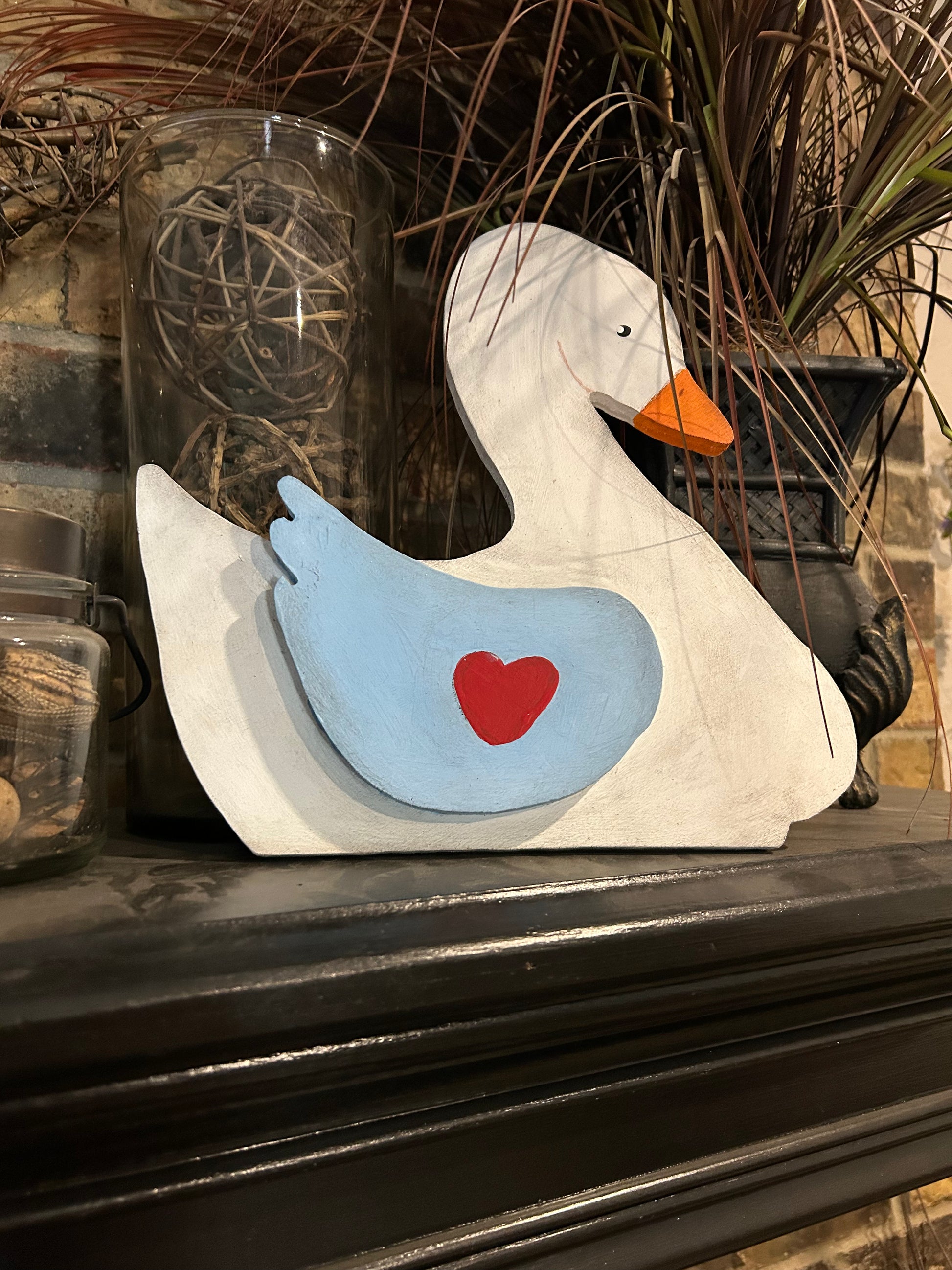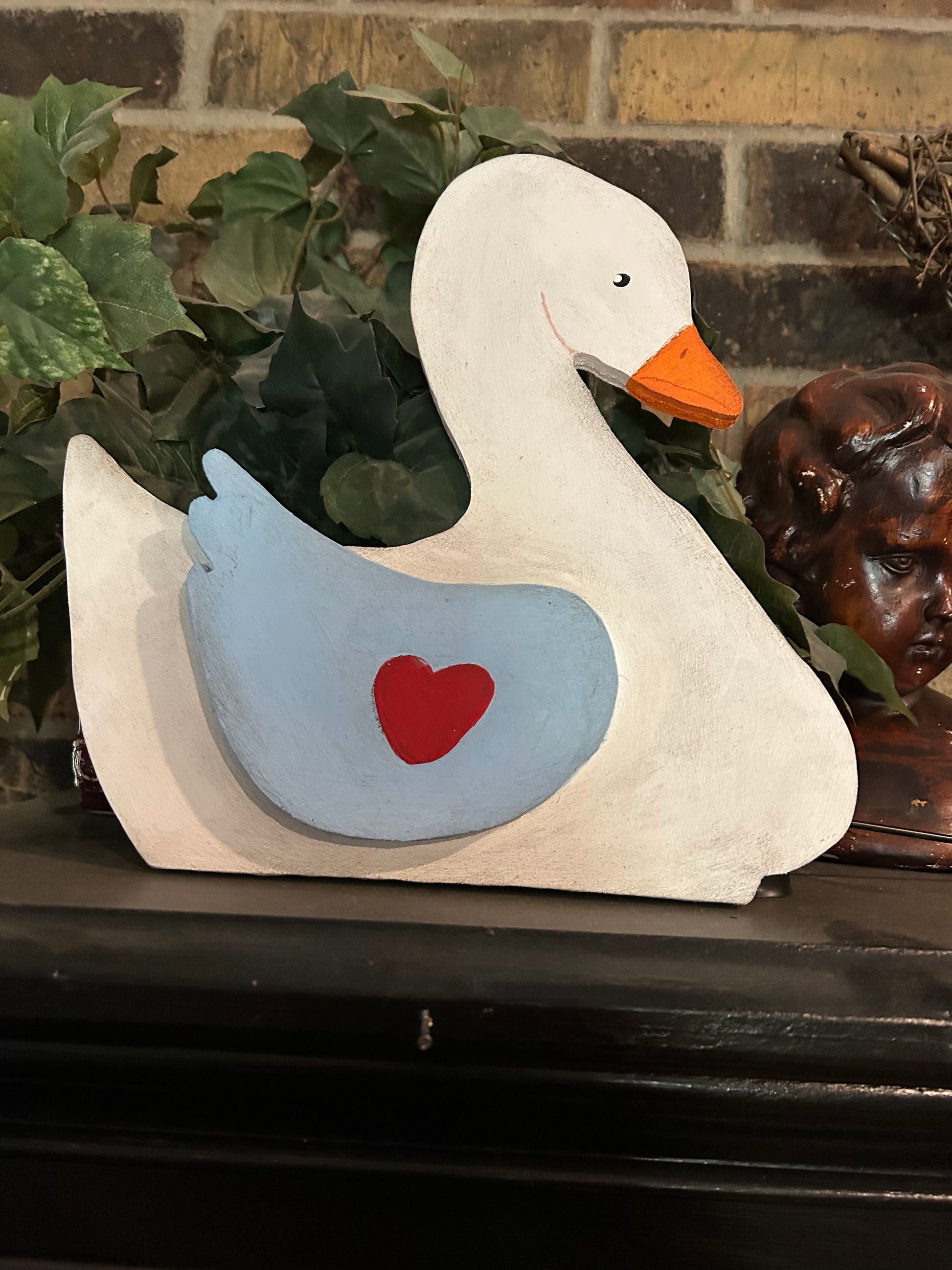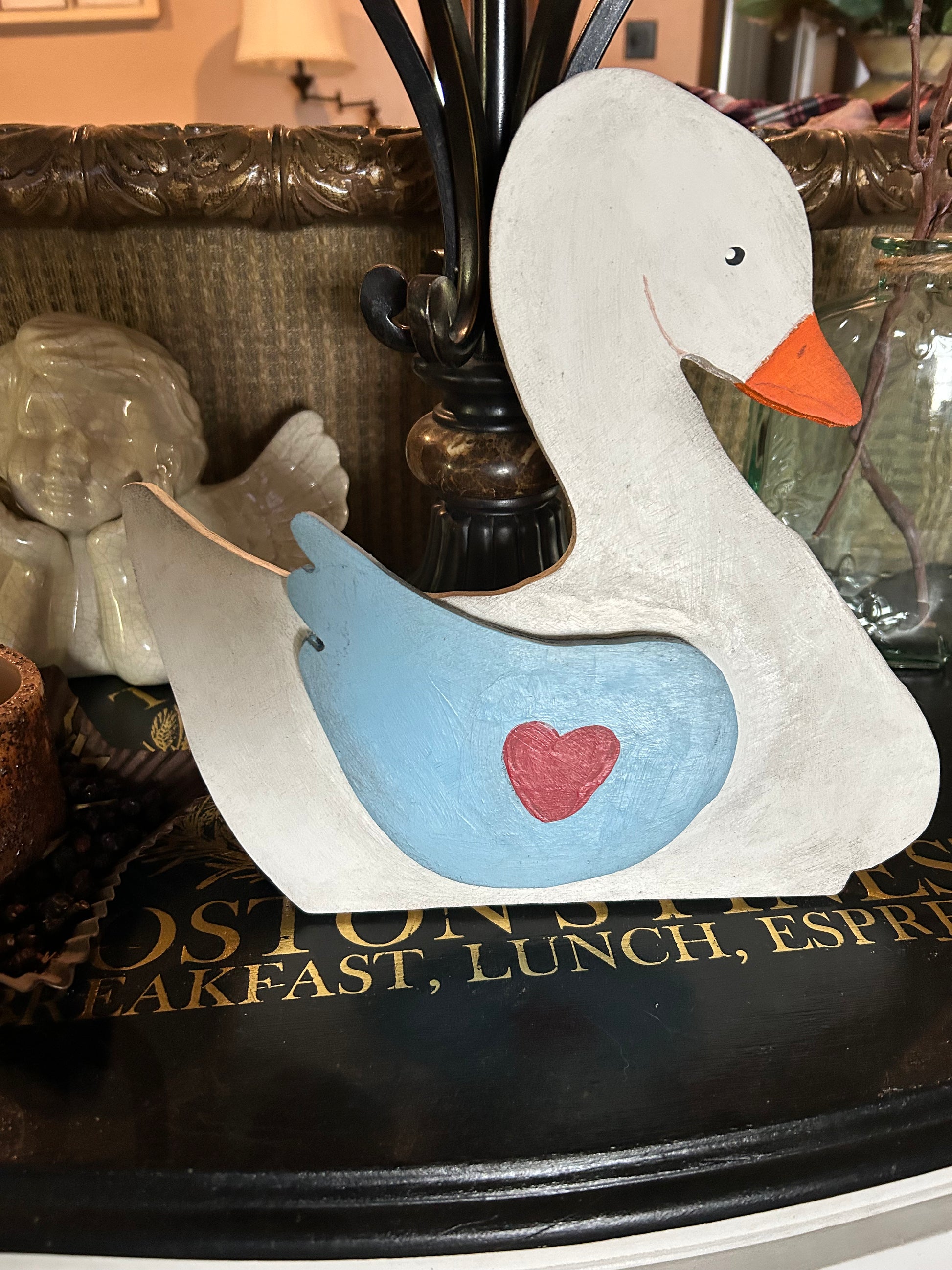Add a touch of nostalgia to your home with this vintage wood goose, custom made by Sara's redesign. Handcrafted from recycled wood and hand painted, this 11 inch tall and 10 inch wide goose with a heart will add a unique charm to any space. Hang it or lean it on a shelf for a personalized touch.