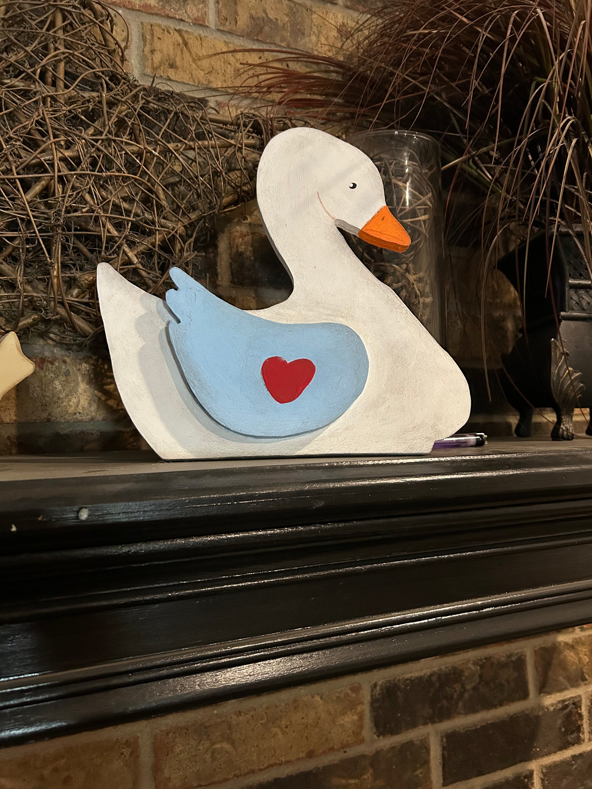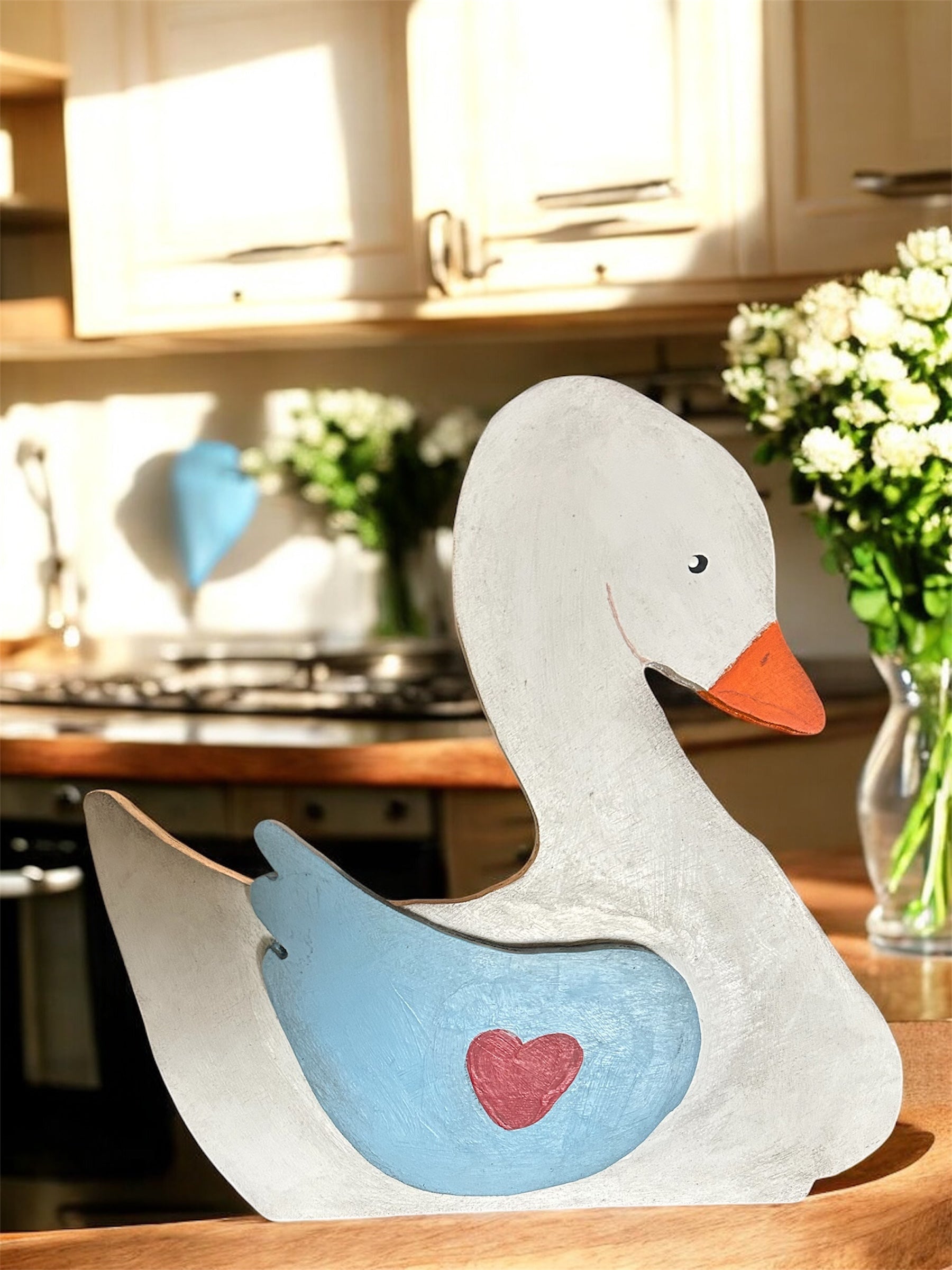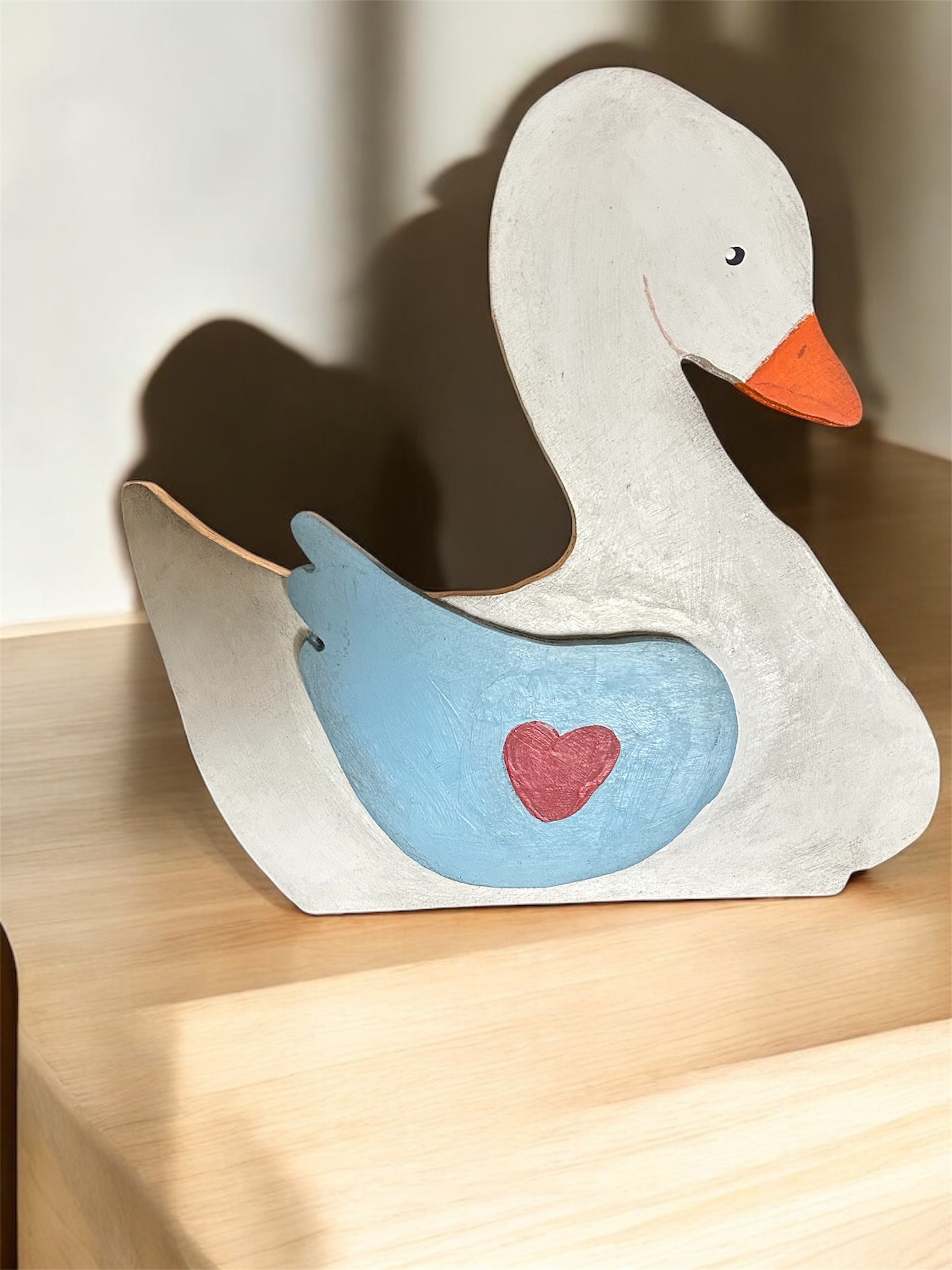 Add a touch of nostalgia to your home with this vintage wood goose, custom made by Sara's redesign. Handcrafted from recycled wood and hand painted, this 11 inch tall and 10 inch wide goose with a heart will add a unique charm to any space. Hang it or lean it on a shelf for a personalized touch.