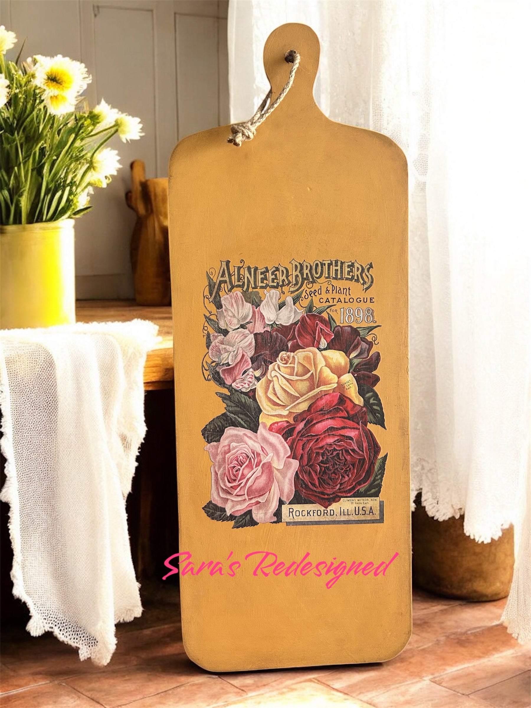 Add a touch of vintage charm to your home decor with our Vintage Yellow Board with Roses. Handmade from recycled wood and painted with a beautiful vintage seed catalog picture, this board is perfect for any room in your home. The stunning yellow color and intricate rose design will add a unique and elegant touch to your space. Size 25 tall 7 in wide.
