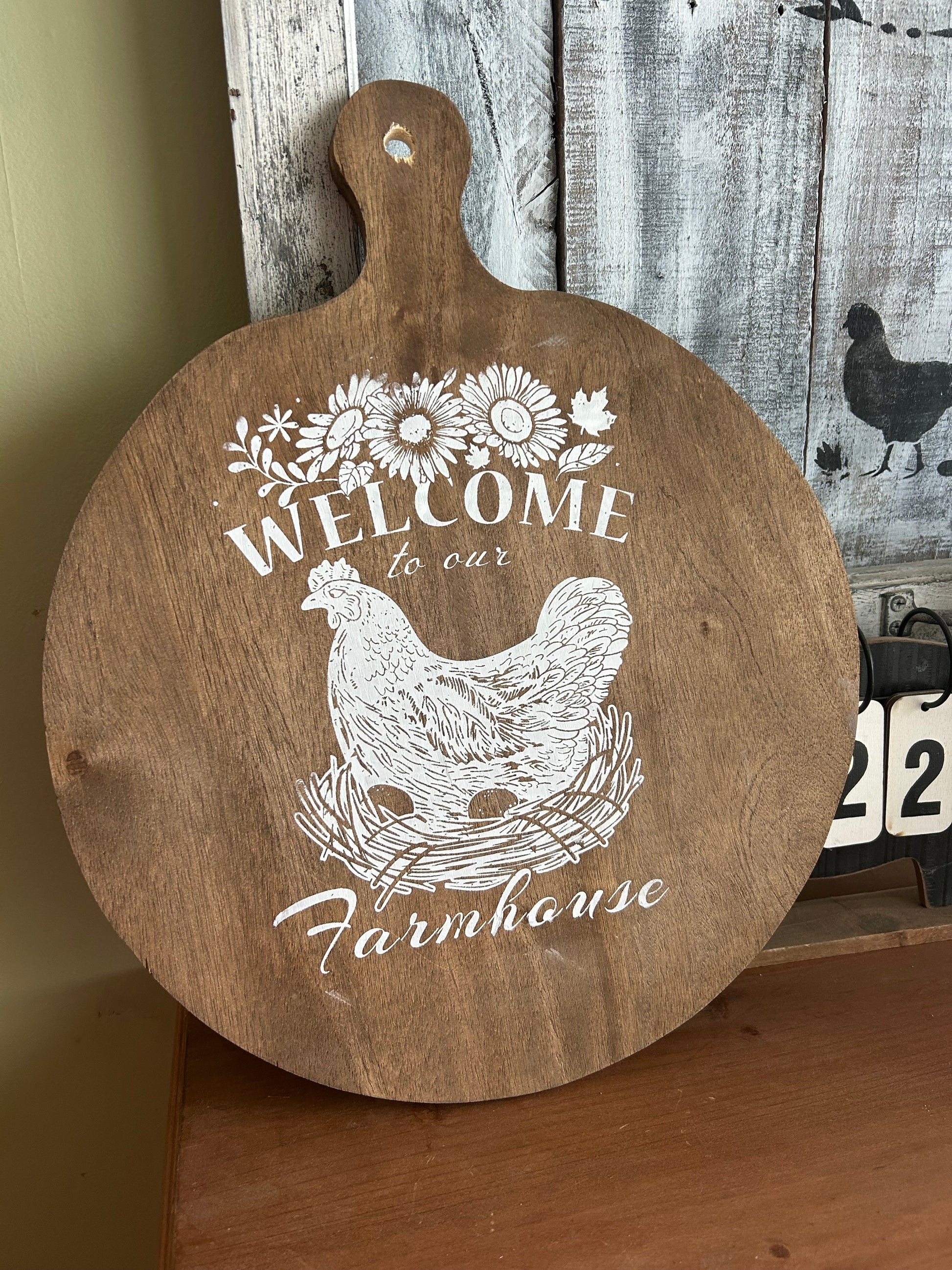 Welcome guests to your home with our rustic and eco-friendly farmhouse nesting hen board. Made by Sara's Redesigned, this vintage-style board is crafted from durable 1/2 inch recycled wood and resembles a traditional cutting board. Perfect for adding a touch of farmhouse charm to any kitchen or dining room. 17 in long and 13 in wide.